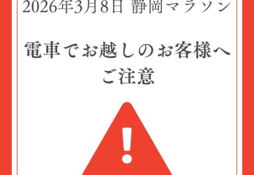 2026年3月8日に静岡マラソンが開催されます。前日は、多くのランナーの皆さまにご宿泊いただくことが予想されます。 当館の送迎バスは午前8時からの運行となっております。大会出場などで早朝にご出発予定のお客様はご注意くだ...
